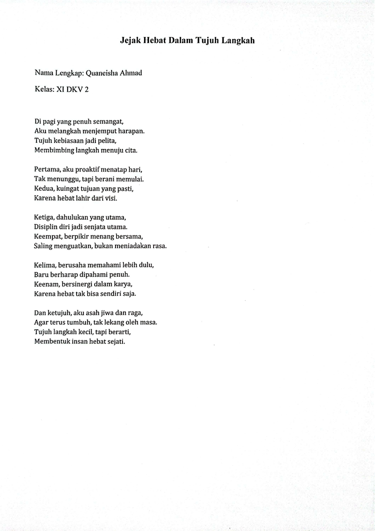 Suatu hari, ibu menegurnya dengan lembut. “Coba Anin biasakan berdoa dan salat tepat waktu. Hati akan terasa lebih tenang,” katanya. Anin pun mulai mencoba. Ia menyiapkan alarm untuk salat, menyalakan ponsel saat beribadah, dan berdoa setiap selesai belajar. Ternyata, kebiasaan kecil itu membuat hidupnya berubah. Ia merasa lebih damai, lebih sabar, dan hari-harinya terasa lancar.
